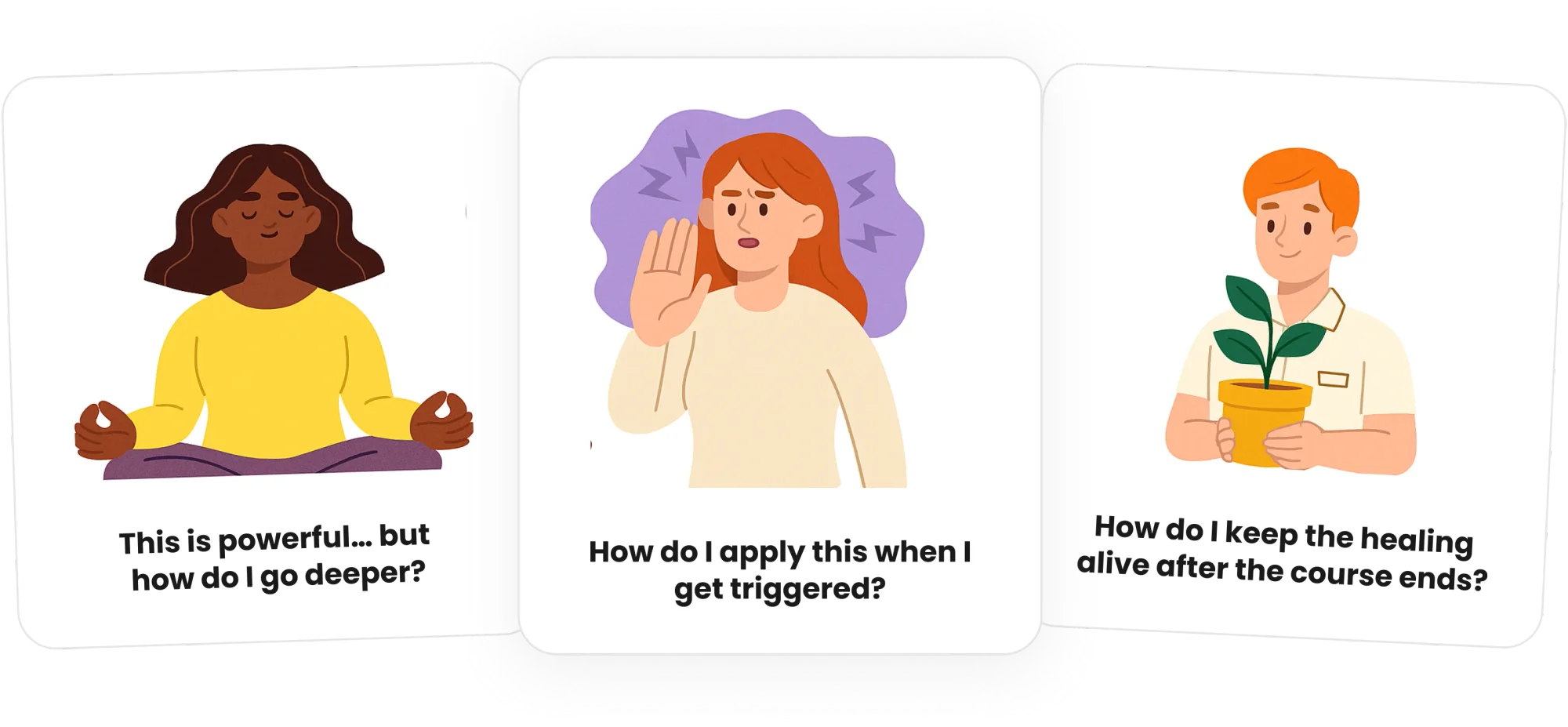 A full year of weekly live coaching, community support, and integration tools to help you apply the teachings in real life, day after day, trigger after trigger.